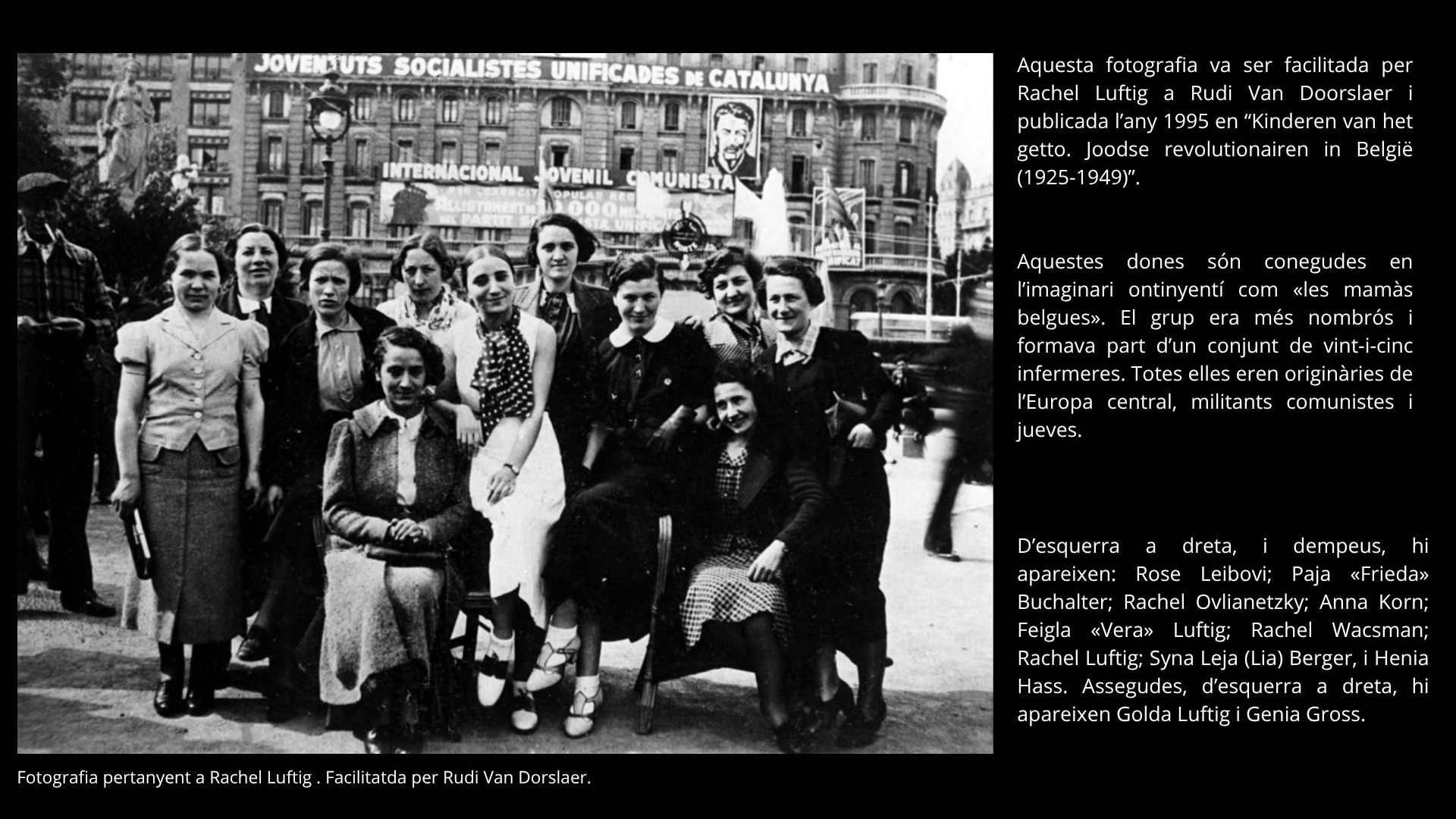 Homes i dones, amb una clara convicció i un fort sentiment solidari, van formar part de les Brigades Internacionals. Entre elles, hi havia moltes dones que arriben des de diferents països amb un objectiu comú: ajudar, cuidar i lluitar per uns ideals compartits. No obstant això, no se’ls va permetre anar al front ni empunyar armes. Moltes van exercir com a infermeres, voluntàries o militants, formant part d’una xarxa internacional de solidaritat que va convertir Espanya en un espai de trobada entre cultures, llengües i experiències diverses.