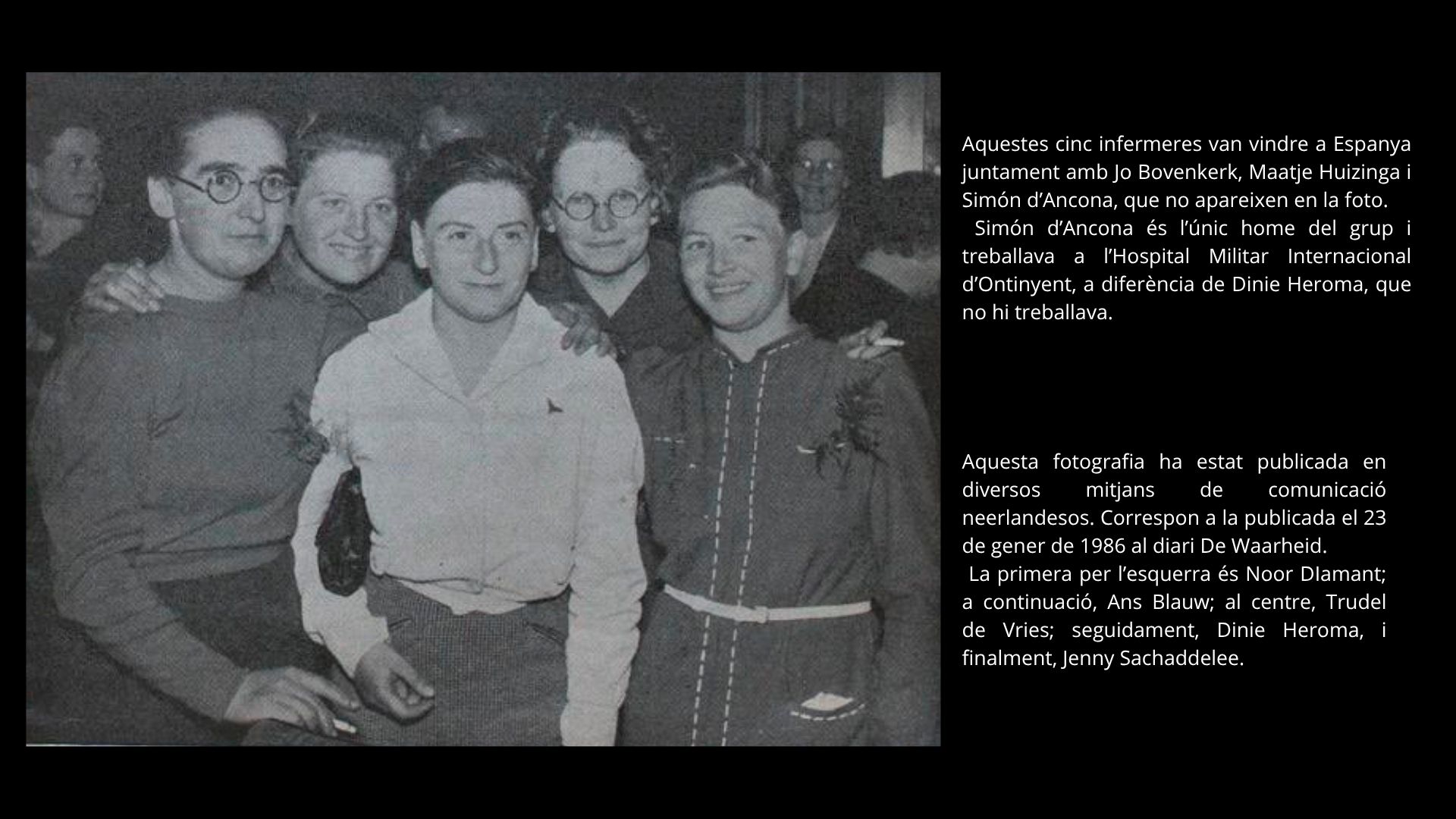 La primera fotografia mostra un petit grup d’infermeres internacionals en un espai sense referències concretes. Sabem qui són, ja que han pogut ser identificades, i podem posar nom a cadascuna d’elles.