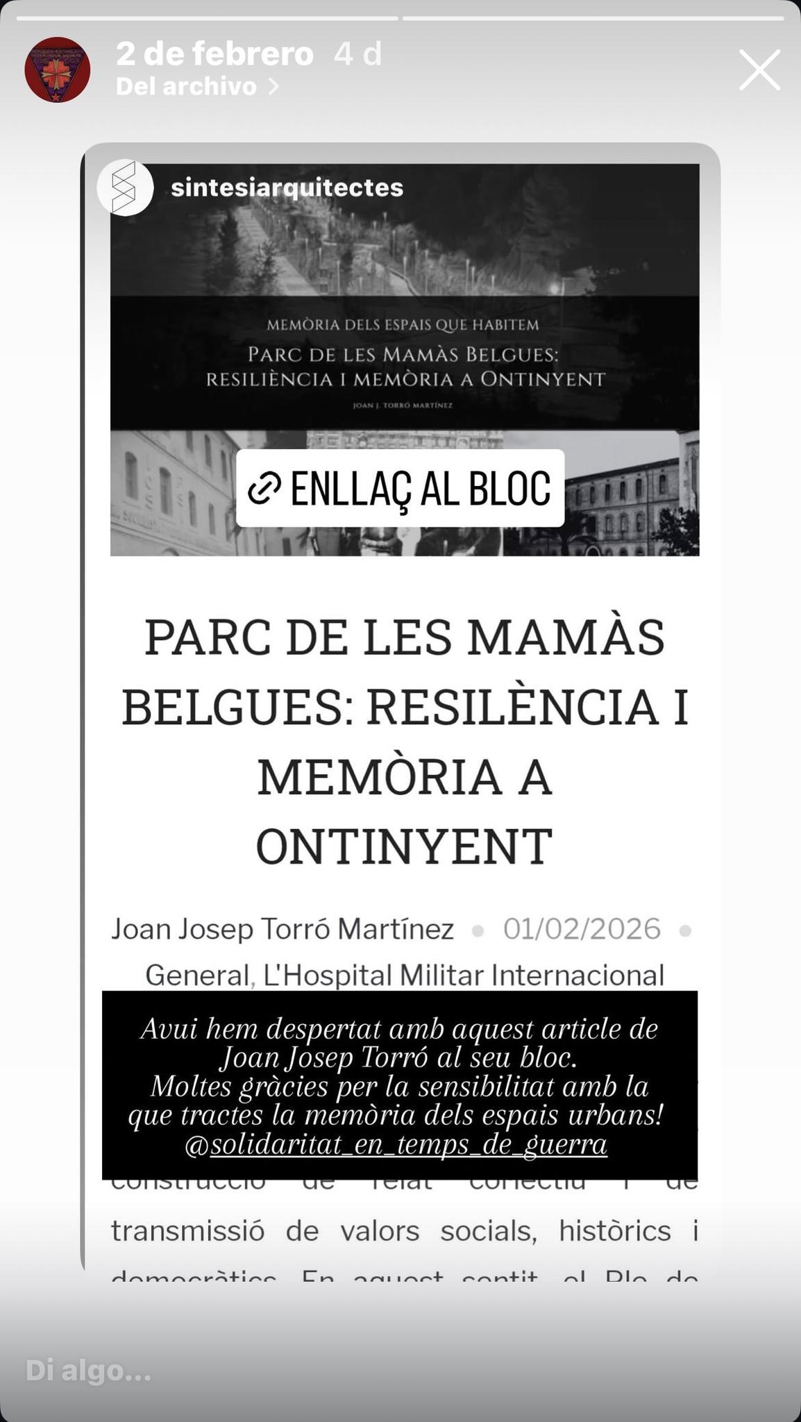 Deixe a continuació la publicació de l’article aparegut en la premsa local i també una captura de pantalla de la referència que l’estudi Sistesi Arquitectes va compartir al seu compte d’Instagram, com a testimoni d’aquesta xicoteta però significativa repercussió. Encara té més valor saber que, quan vam projectar el documental al mateix parc, alguns membres de l’equip d’arquitectes hi van assistir i, en un exercici d’humilitat i discreció, en cap moment no van posar de manifest la seua presència.
